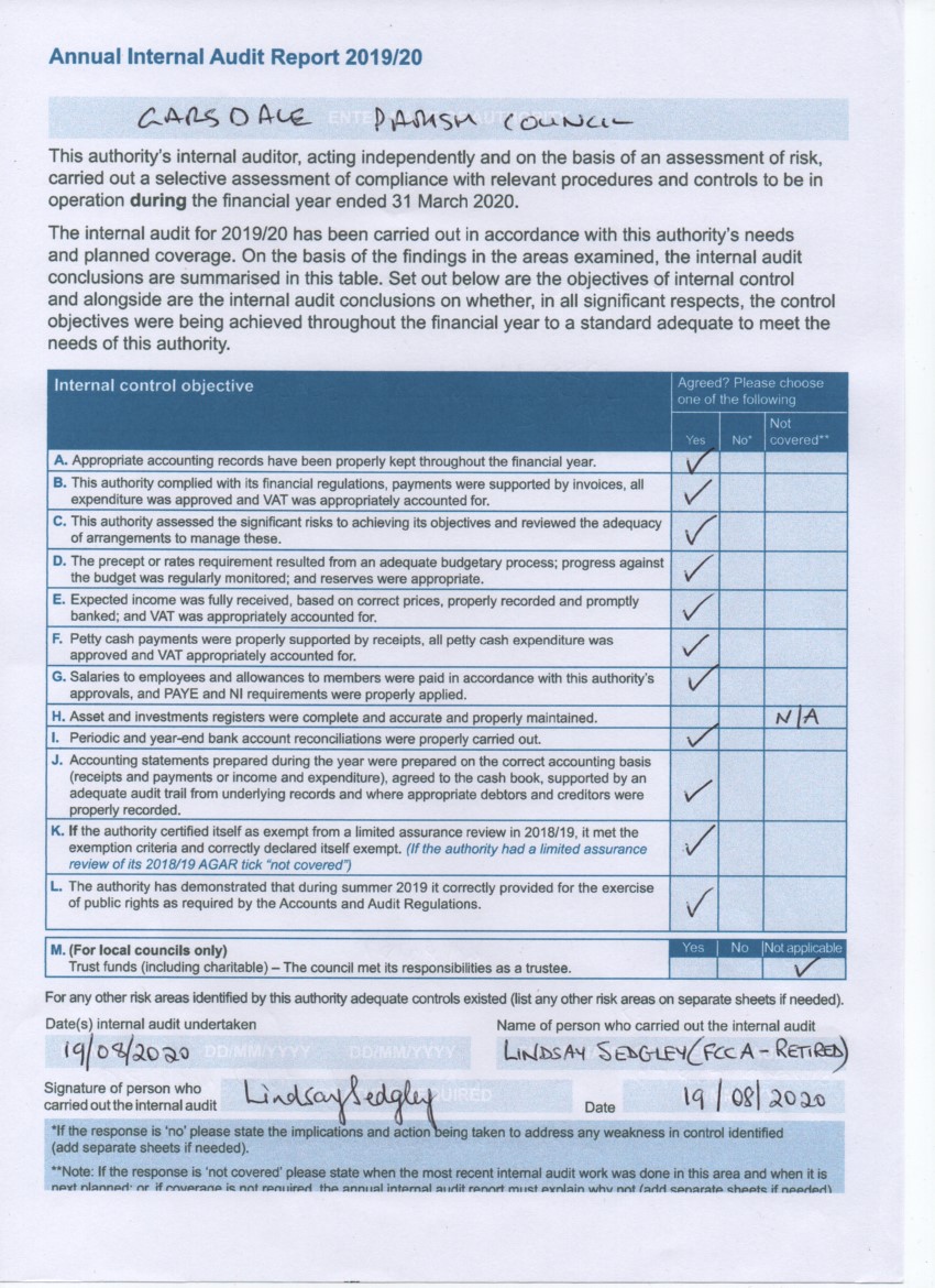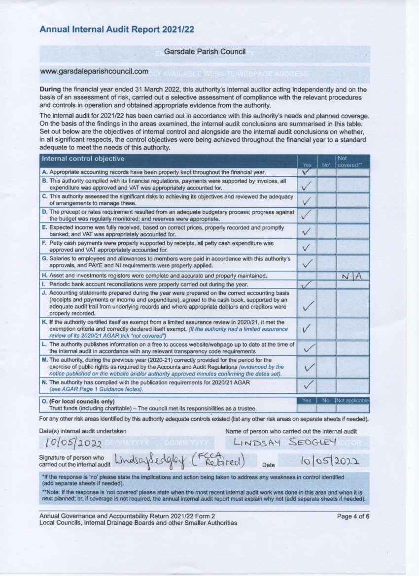 The Annual Internal Audit is a signed checklist showing whether certain aspects of the council running has been internally reviewed, and whether the council conforms.