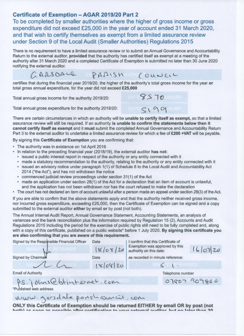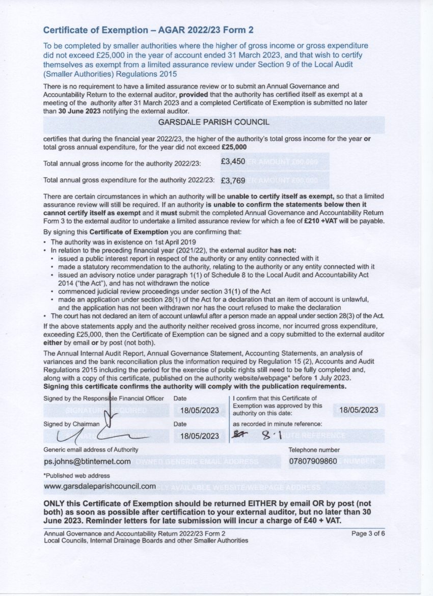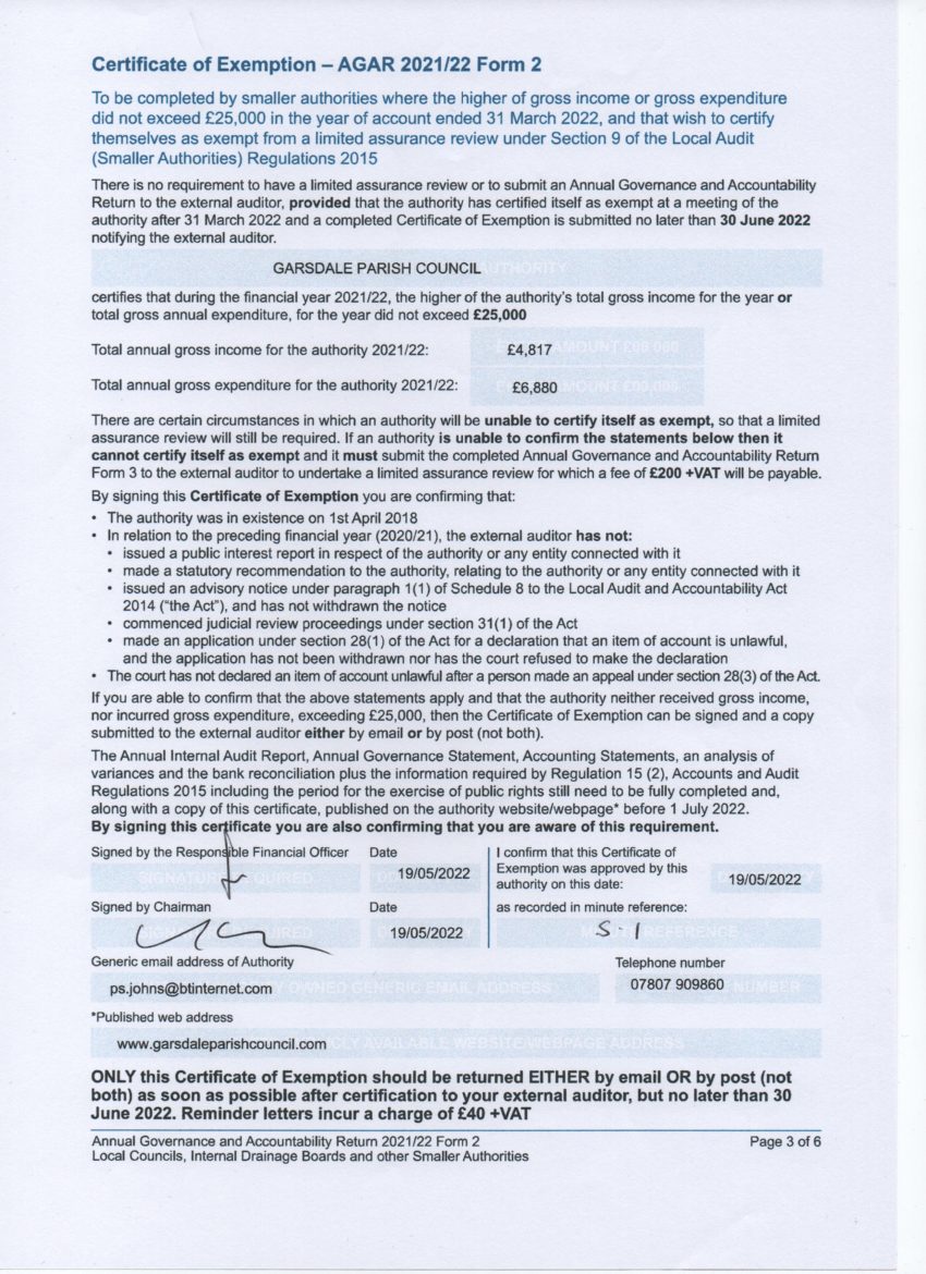 Certificates of Exemptions are created if a local council is below the £25,000 threshold for expenditure. This forms part of the AGAR.